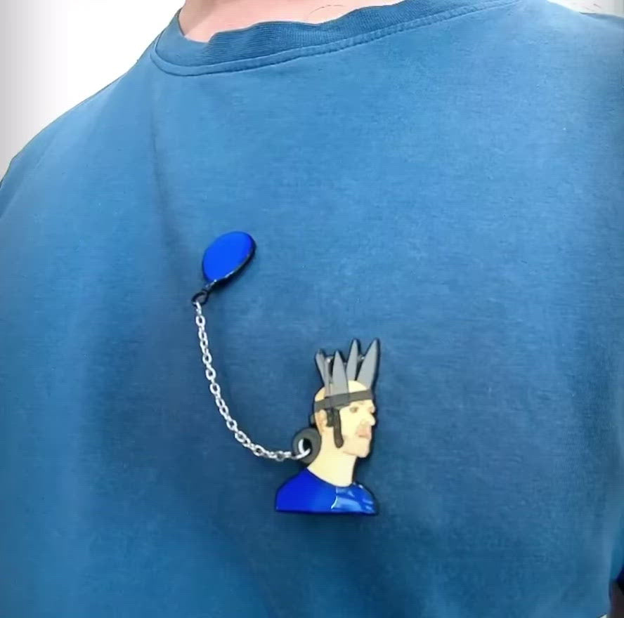 jan hakon erichson enamel pin with Jan wearing a blue shirt and  crown of duct taped knives with a blue balloon attatched to a chain goin through the duct tape roll.