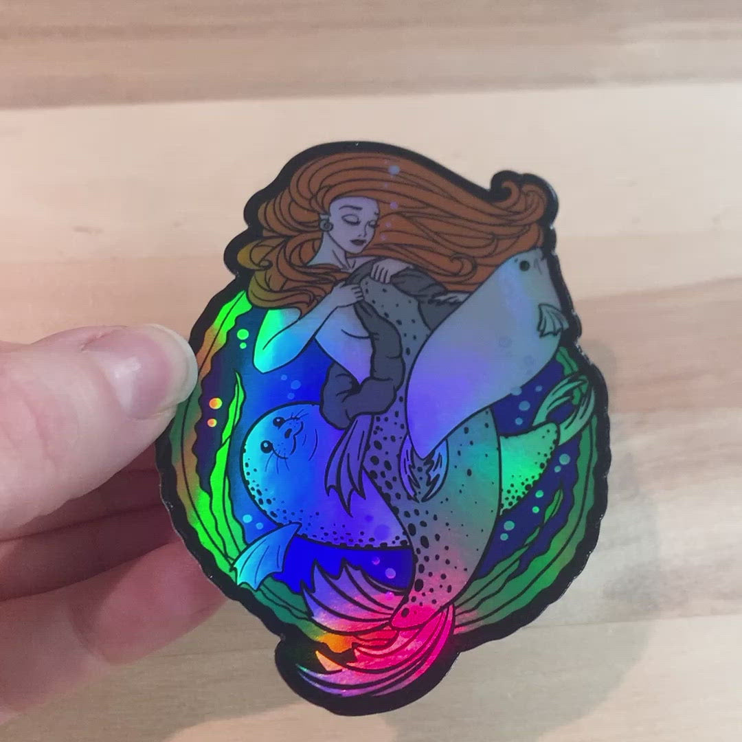 This 2.5" x 3.2" sticker features our red-haired Selkie Mara with plenty of rainbow holographic wonder.